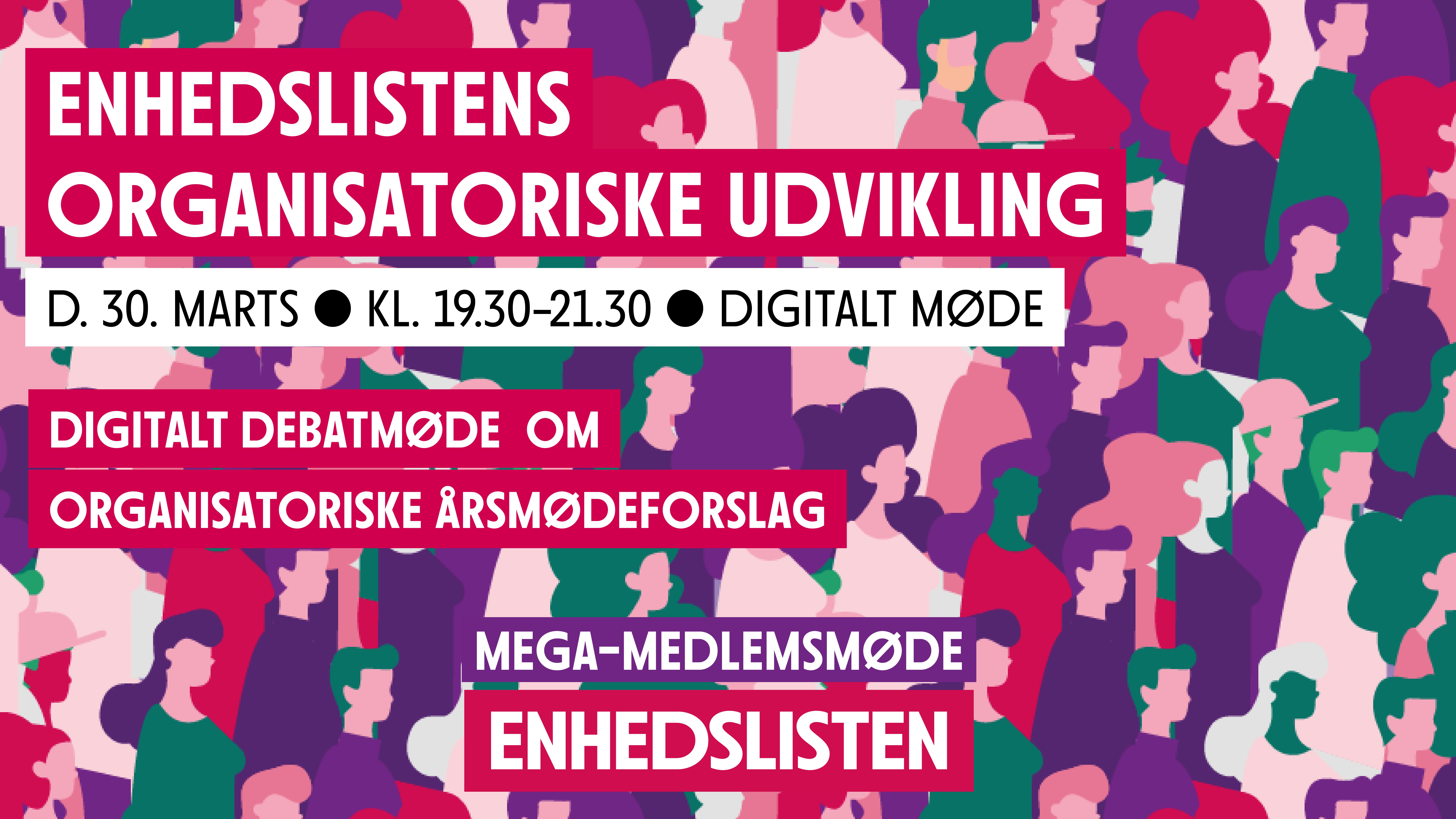 Indhold på mødet: Trine Simmel og Mathilde Vinther fra HB vil fremlægge HB's hovedforslag til Enhedslistens organisatoriske udvikling 2021-2024. Herefter vil der være et par korte oplæg fra forskellige medlemmer samt debat i grupper og god tid til debat i plenum. Mødet er både henvendt til dem, der påtænker eller har stillet ændringsforslag og til alle andre medlemmer, som interesserer sig for organisationsudvikling i partiet eller gerne vil klædes bedre på til debatten på årsmødet.